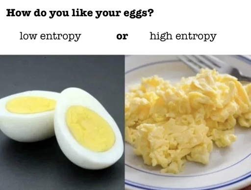 Isn’t scrambled lower entropy? Like how dye in water moves from fully concentrated at one point to fully diffused throughout the water?You had to do work to scramble them and now it would take a lot more energy to get them back to separate the white from the yolk so it looked like the hard boiled.This is all completely wrong, I was thinking about Gibbs free energy decreasing with spontaneous reactions.