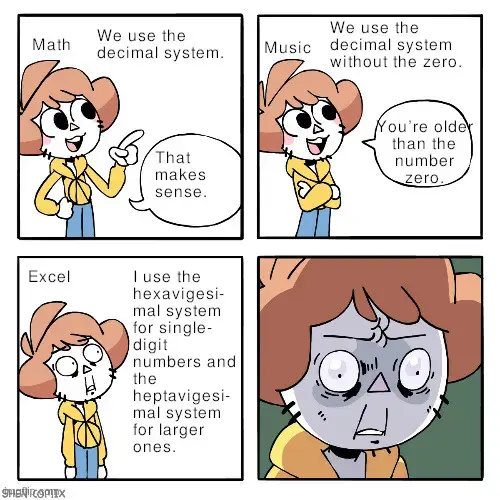 In Excel, shit hits the fan when you need to convert column names (A, B, C…) to numbers (0, 1, 2…). Since we use 26 characters as our ‘digits’, we’re in the hexavigesimal system. Knowing what I told you in the first paragraph, you’d expect the first double-digit column (AA) to be 26. And you’re right.