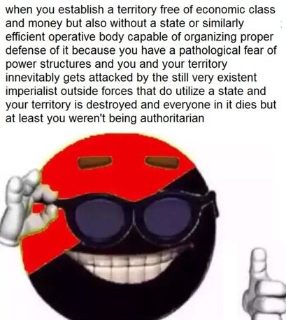 this is why workers’ council republics are better than total anarchy. There needs to be a state apparatus or itll collapse due to egoism.