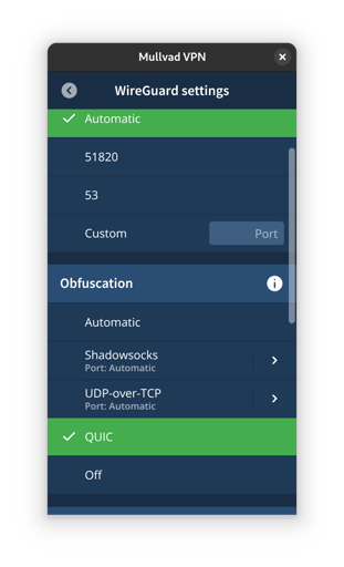 We are excited to add QUIC obfuscation for WireGuard, aimed at helping users bypass firewalls and censorship. This new obfuscation method is now available on all desktop platforms.
