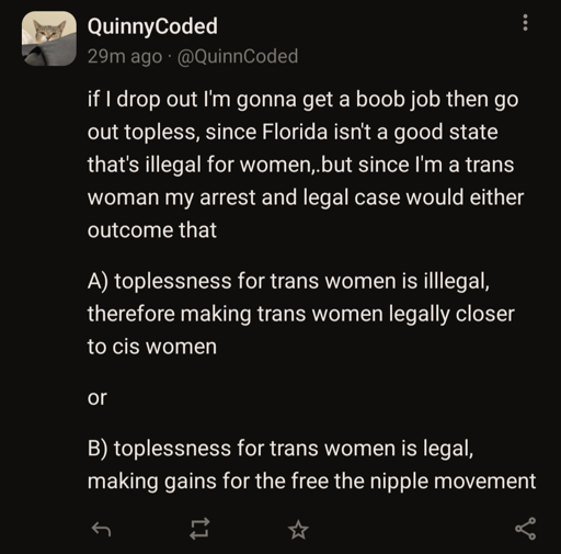 2: it’s legal which would be a win for free the nipple movement because it could be argued “that trans women can do it and their boobs are the same as ours”