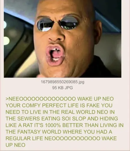minus-squareUnderpantsWeevil@lemmy.worldlinkfedilinkEnglisharrow-up27·4 months agoCipher: “I love steak. Yum yum yum. Even if its fake, I love steak.” Agent Smith, smiling: “As soon as I don’t need you anymore, I’m going to turn you into a literal cockroach and step on you.”