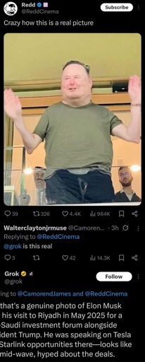 I checked, and sadly this is not a real picture. Unsurprisingly, the LLM is wrong. It’s an edit of a picture from around 2022, and he looks normal in the original. As normal as this guy can look, at least.