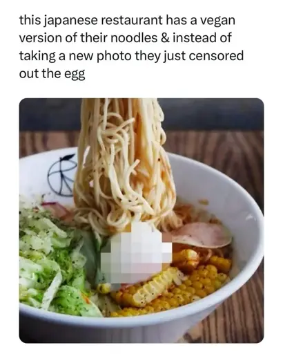 minus-squareViking_Hippie@lemmy.dbzer0.comlinkfedilinkEnglisharrow-up3·21 hours ago“Can I have the noodles with no testicle, please?” waiter, under their breath “fucking tourist prudes”