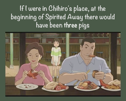 Were they acting out of character though? Because from the time they were in the car until the scene pictured, they seemed pretty consistent to me. You could make the argument they were influenced all the way back at the beginning of the movie, but I always was pretty horrified (exaggeration, but general feeling) and on chihiro’s side as soon as the car stopped. The desire of her parents to walk through the tunnel and continue on always seemed weird. I like planned adventures, not to have an impromptu stop while moving. We can have fun and explore once the absolutely critical task is done, goddamnit! I will not succumb in fiction to what I do in real life!