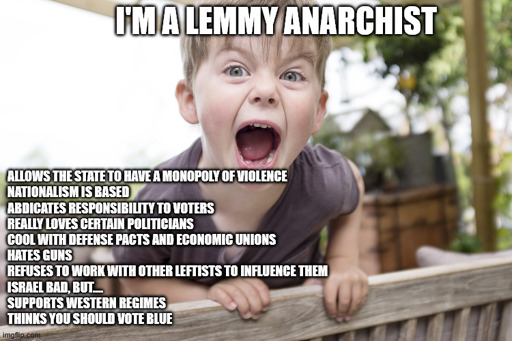Look, this is lemmy memes and I’m not the Cowbee for anarchism. You should try reading more in your life instead of politics by vibes. Check out Kropotkin.