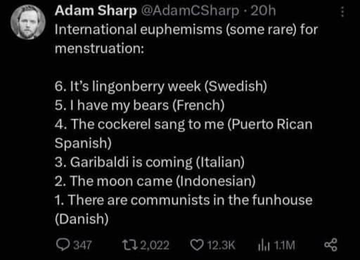 minus-squareNailbar@sopuli.xyzlinkfedilinkarrow-up1·4 days agoThere’s a Southpark episode where aunt Flo visits, and they say she visits every month and stays for a week. So I guess it’s a common saying in USA, at least.