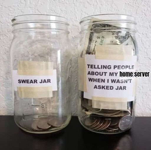 The right one is labelled “Telling people about my [home server] when I wasn’t asked jar”. “Home server” is edited over the top of whatever was originally written on the jar. This jar is filled to the brim with lots of coins and paper notes.
