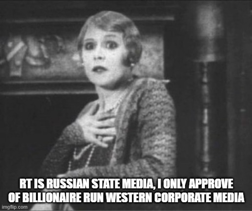 I don’t think you understood the meme at all. It is someone pearl clutching about RT, namely people like yourself on lemmy.world on c/worldnews while not understanding it is the same bullshit they are currently reading. I never said RT wasn’t, in fact I’m implying they’re the same.