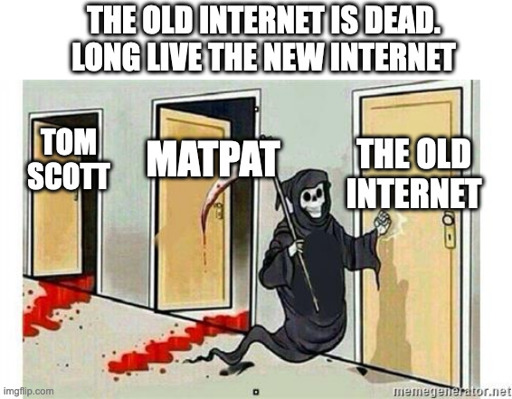 The general reaction to this post being “Who’s Matpat?” is super interesting to me. And the comments saying that Tom Scott and Matpat aren’t old are also interesting since they follow the trend in Lemmy of the average age being a lot older than any other social network. I’m Gen Z and primarily consume content via a very Zoomer-heavy platform, YouTube, and the only other social network I have is Lemmy, which I’d say is very millennial-dominated. Which is why I stayed on Lemmy when I first got on here in June, since I liked the difference in opinion on the same topics on Lemmy and YouTube. Nothing related to the post, just something I’ve noticed for a while but never shared.
