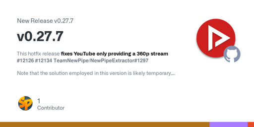arrow-up1199arrow-down1external-linkNewPipe v0.27.7 released (YouTube hotfix)github.comLIE@lemmy.dbzer0.com to Open Source@lemmy.ml · 8 months agomessage-square10linkfedilink